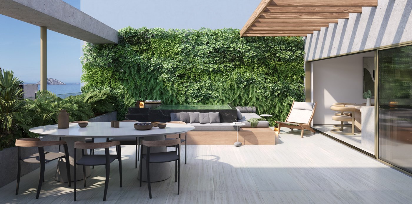 "Ipanema é um bairro associado à praia e ao agito, mas também tem a sofisticação e a delicadeza entre seus diferenciais. O Riô, pautado na exclusividade de apenas 31 apartamentos, reflete a nascer e o pôr do sol, os raios de luz por entre as copas das árvores, a névoa da maresia no fim de tarde à beira mar e a penumbra da noite. Sua fachada é uma composição entre transparência das esquadrias, que permitem a máxima entrada de luz natural, e volumetria harmônica e ritmada".